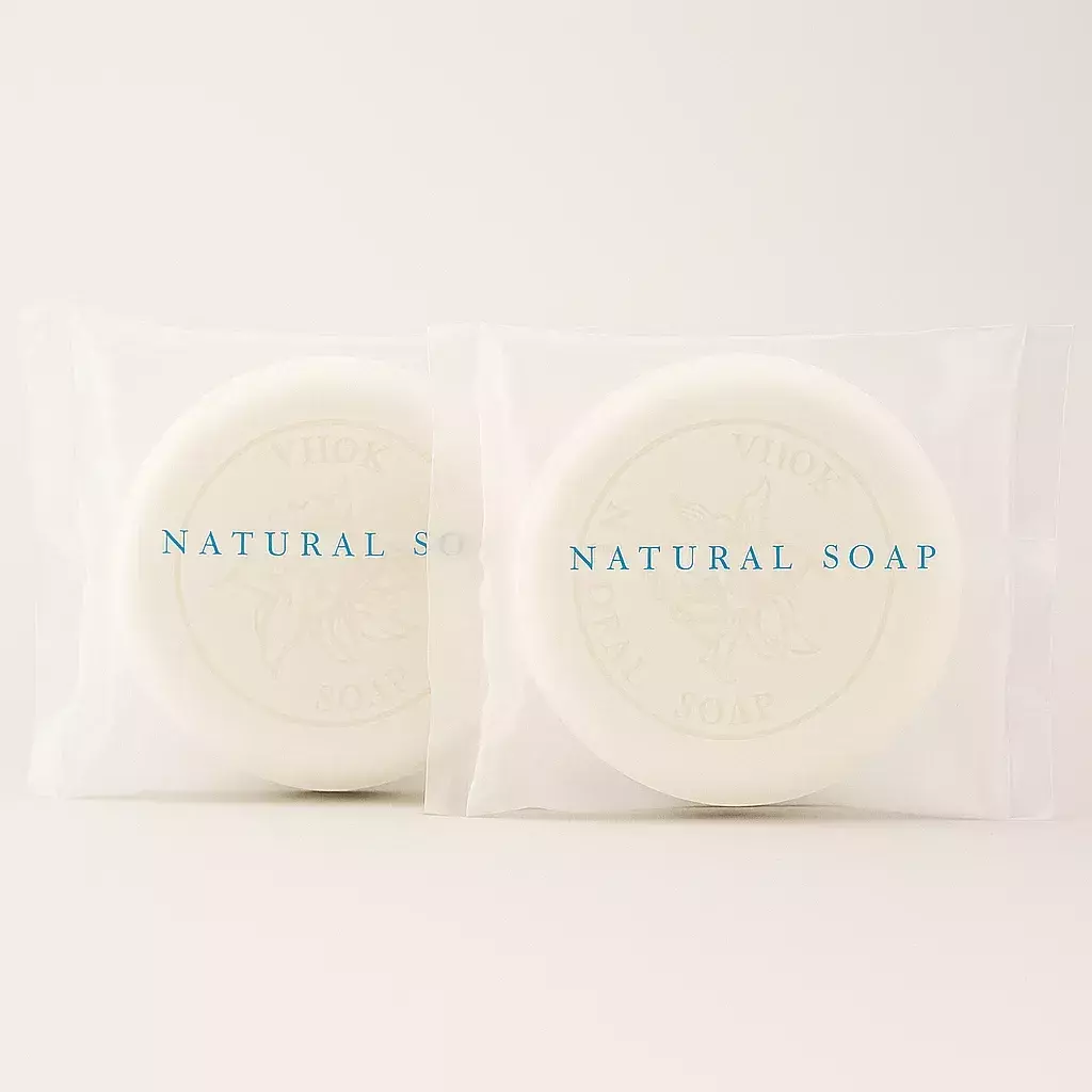 Envasado en flow pack de polipropileno translúcido con acabado mate, este jabón ofrece una imagen sobria y elegante que transmite calidad y excelencia. El diseño Natural Soap está presente tanto en la impresión del envase como en el estampado de la pastilla, logrando una presentación coherente y distinguida.