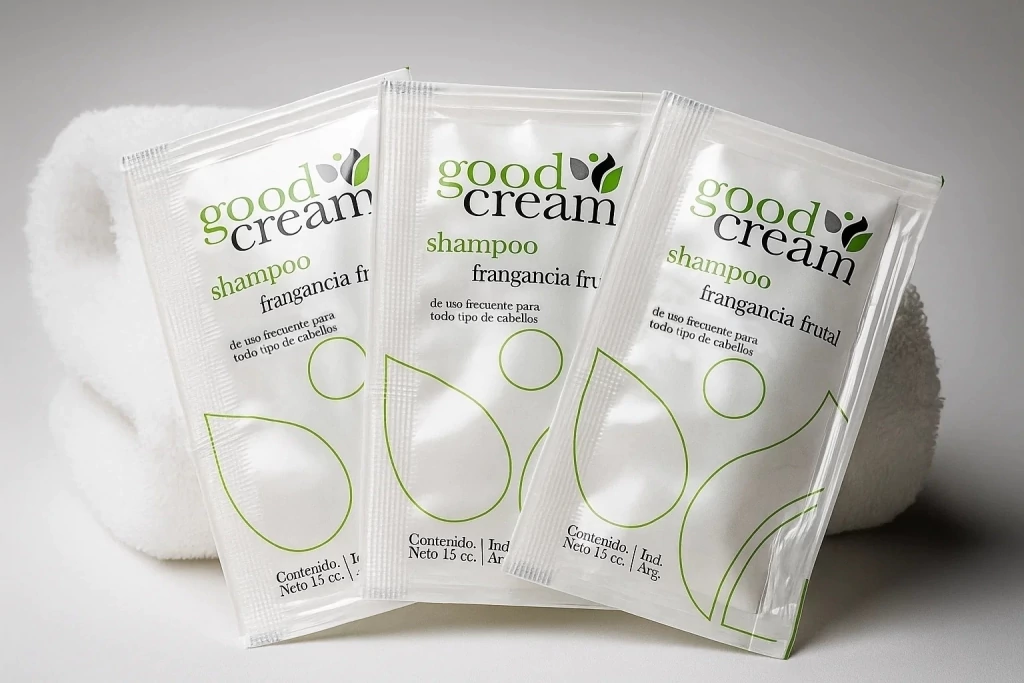 Brindá una experiencia superior a tus huéspedes con el Shampoo Good Cream en sachet de 15 ml, ideal para alojamientos que buscan una presentación más generosa sin perder practicidad. Su fórmula suave limpia el cabello dejando una sensación fresca y perfumada, adecuada para todo tipo de cabello.